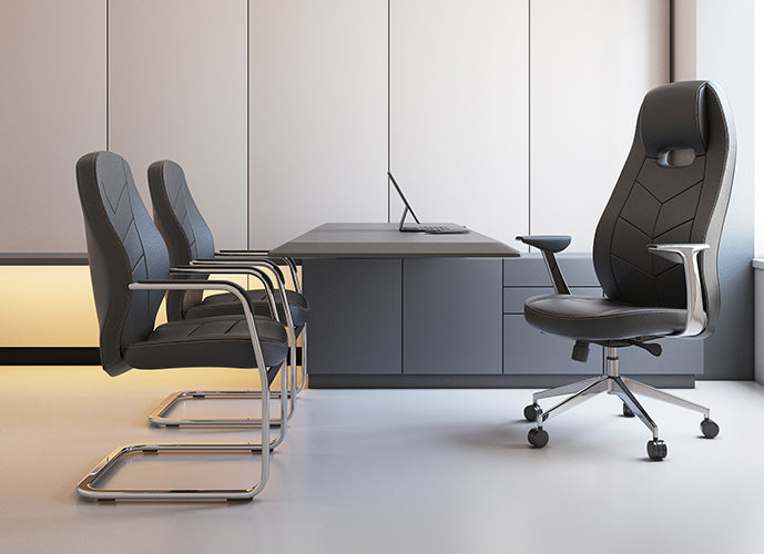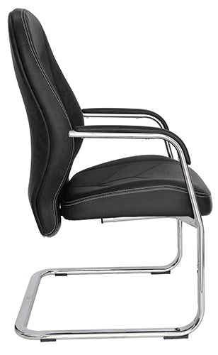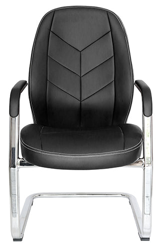 base: trineo de acero tubular rectangular de 1 1/2" X 3/4", calibre 14; con terminado en cromo. Los brazos son una extensión de las mismas patas, están acojinados y tapizados en soft revolving leather color negro.