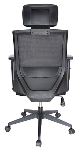 respaldo: en malla de diseño ergonómico con cabecera acojinada y tapizada.