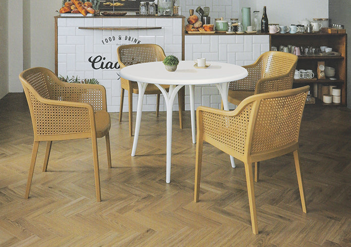 mesa: en termoplástico polimerizado de polipropileno para intemperie e interior, resistente a los rayos ultravioleta (UV), al ambiente salino, a los cambios bruscos de temperatura y a corrosión de ácidos alcalinos; es inocuo y no guarda aromas.