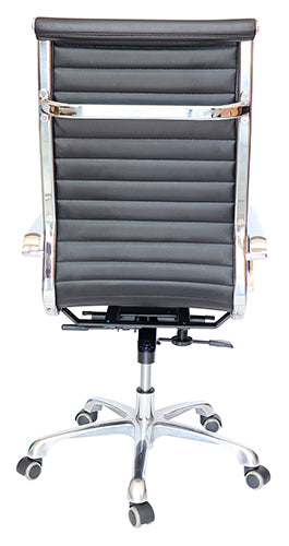 asiento y respaldo: alto de un sólo corte tensado con la estructura para dar una suspensión única y adaptarse al cuerpo tapizado en soft revolving leather acojinado con hule espuma laminada flexible con densidad de 17 kgs/m3 y alta resiliencia; toda la estructura es de acero tubular con terminado en cromo.